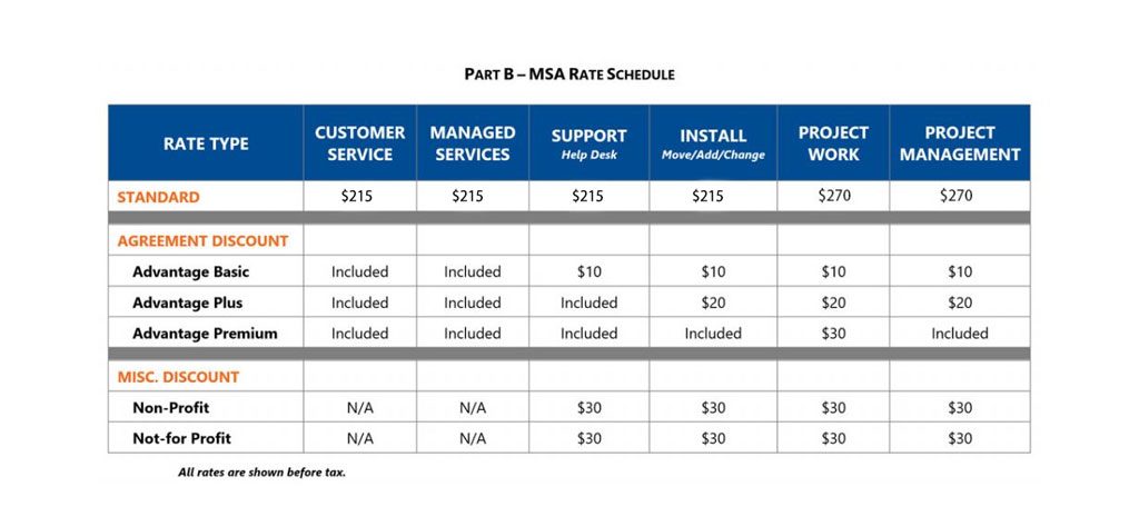 Except as otherwise set forth in an Order: (a) all Services performed during Business Hours will be incurred at the rate applicable to such Services (the “Base Rate”) as set forth on the Website at www.ciscom.com/rates (the “Rate Schedule”); (b) all Services performed during Non-Business Hours will be incurred at 1.5 times the applicable Base Rate; and (c) all Services performed on Holidays will be incurred at 2.0 times applicable Base Rate. CisCom reserves the right to modify the Rate Schedule and the Base Rates therein from time to time during the Term, provided that such modification does not result in an increase of the Base Rates by more than ten (10) percent (10%) above the Base Rate applicable immediately prior to such increase.